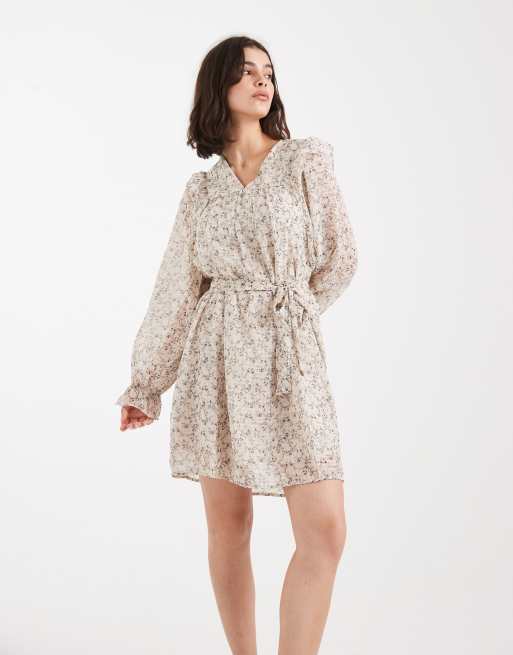 Vero Moda - Mini-jurk met ruches aan de zoom, blousonmouwen, ceintuur en bloemen print in crème