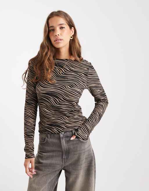 Vero Moda - Top van jersey met lange mouwen, textuur en dierenprint in nertsbruin en zwart