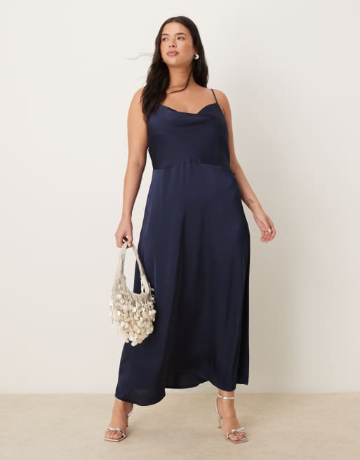 VILA Curve - Satijnen maxi cami-jurk met gedrapeerde halslijn in marineblauw