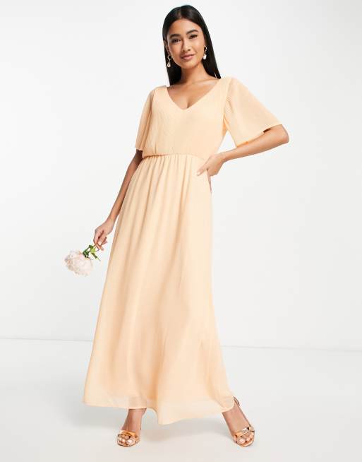 Vila - Exclusives - Lange geplisseerde bruidsmeisjesjurk met uitlopende mouwen in abrikoos