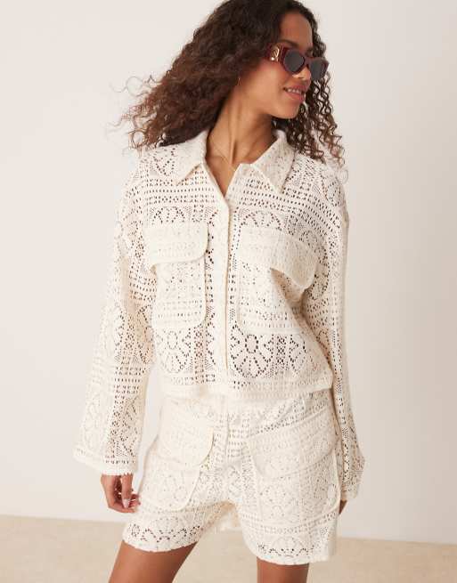 VILA - Gebloemde co-ord set van gehaakt cropped utility-overhemd en short in crème