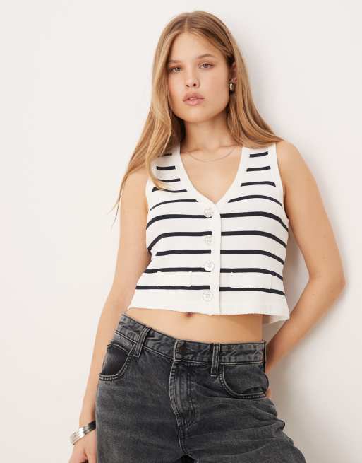 VILA - Gebreid hemdje met gouden knopen in marineblauw en wit