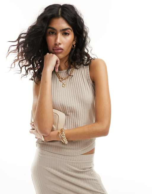 Vila - Geribbeld topje in gemêleerd beige, deel van co-ord set