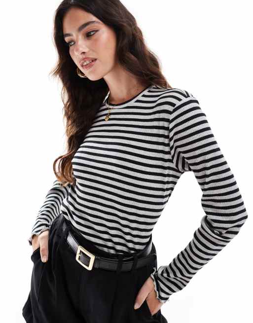 Vila - Geribbelde gestreepte top met lange mouwen en geschulpte rand in gemêleerd grijs