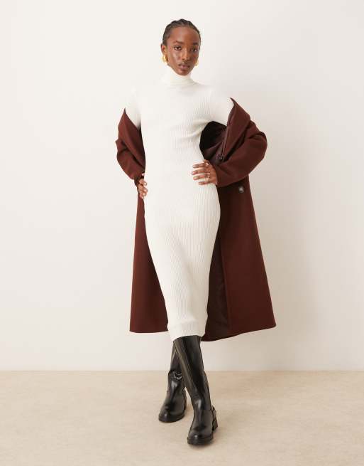 Vila - Geribbelde midi jurk met col en lange mouwen in crème