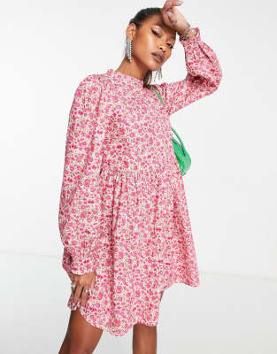 Vila - Mini-smockjurk met lange mouw in roze print