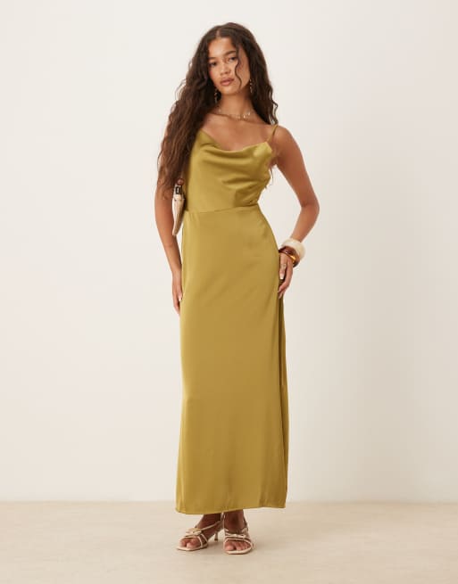 VILA - Satijnen maxi-jurk met gedrapeerde halslijn in olijfgroen