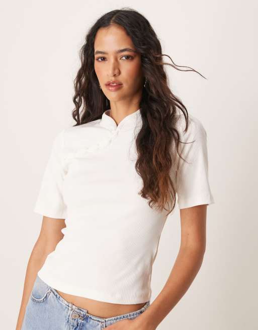 VILA - Top met korte mouwen en asymmetrische halslijn met knoopdetail in crème