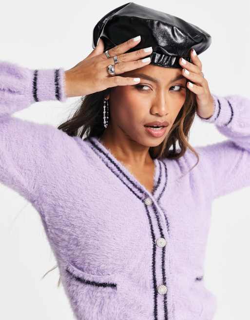 Violet Romance - Pluizig gebreid vest met contrasterende biezen en knopen van siersteentjes in paars