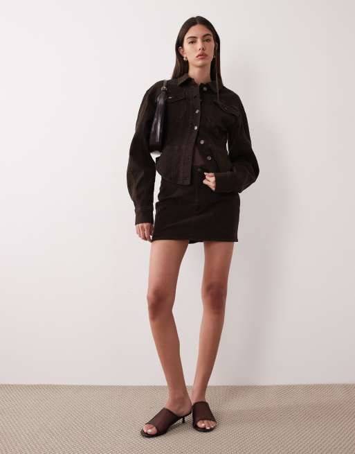 Wanderdoll - Alix - Getailleerde co-ord set van denim jack met naaddetail in de taille en minirok in mokka