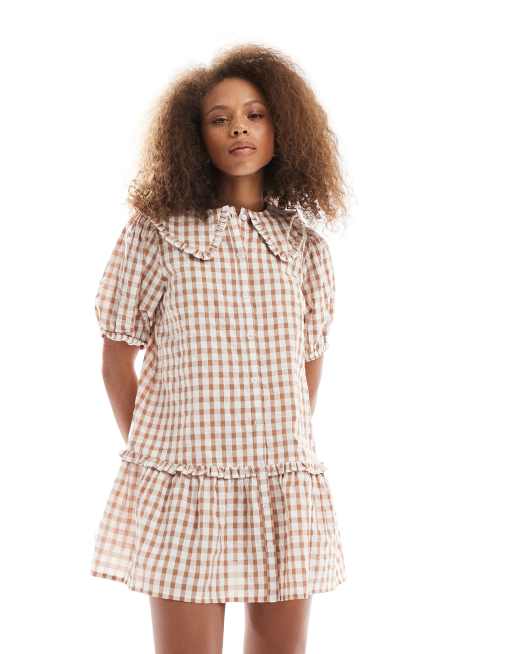 Wednesday's Girl - Aangerimpelde mini jurk met gingham ruit en textuur in roestbruin
