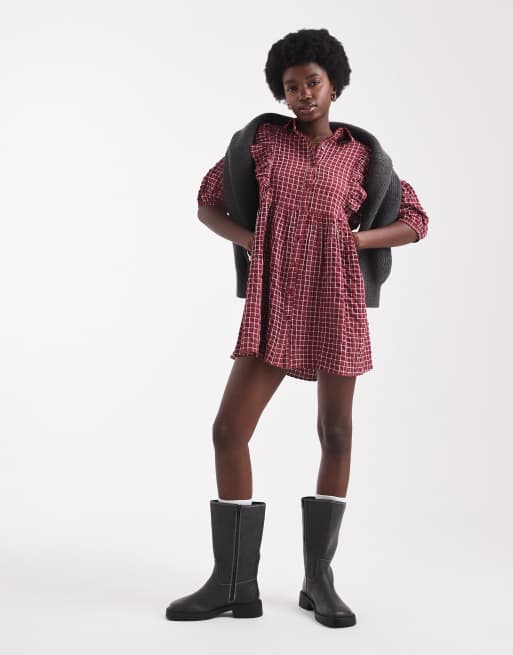 Wednesday's Girl - Aangerimpelde mini jurk met ruiten en ruches in donkerrood