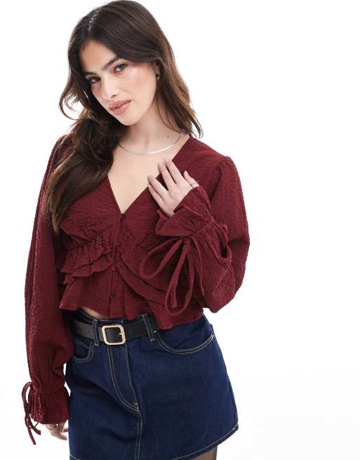 Wednesday's Girl - Blouse met textuur en gestrikte mouwen in dieprood