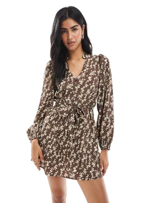 Wednesday's Girl - Mini-jurk met gestrikte taille en bloemenprint in bruin