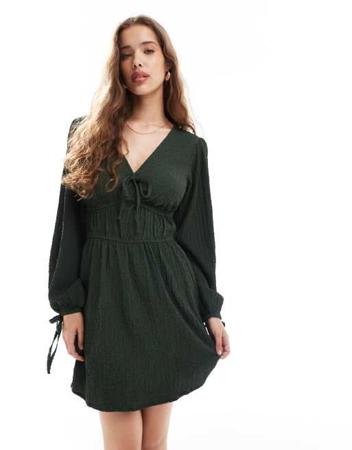Wednesday's Girl - Mini jurk met textuur en gestrikte mouwen in bosgroen