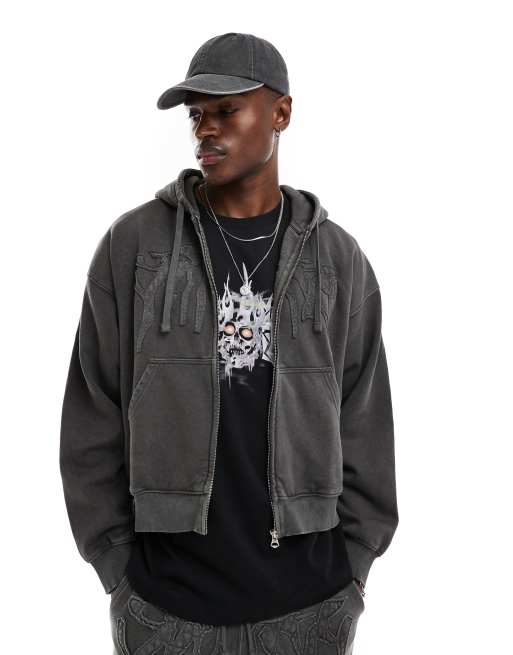 Weekday - Boxy hoodie met rits en 'Destiny'-borduursel in donkergrijs met wassing, deel van co-ord set