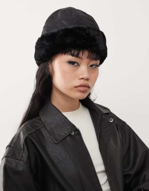 Weekday - Nylon hoed met rand van imitatiebont in zwart