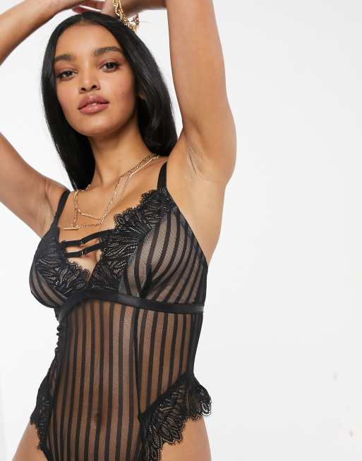 Wolf & Whistle - Vollere buste - Body van gestreept mesh-kant met bandjes en uitsnijding in zwart