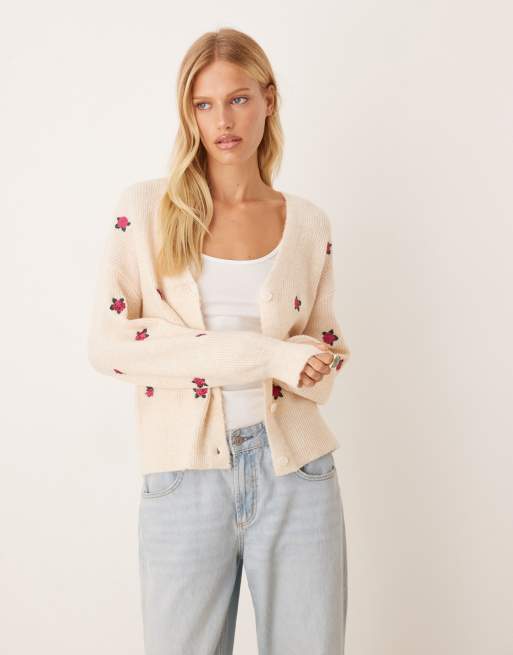 YAS - Gebreid vest met geborduurde rozen en ballonmouwen met boorden in crème