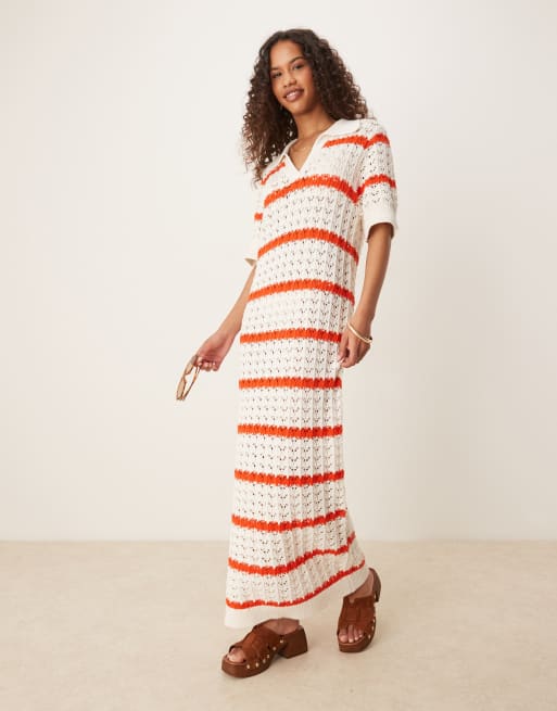 YAS - Gehaakte maxi jurk met korte mouwen en polokraag in crème en rode strepen