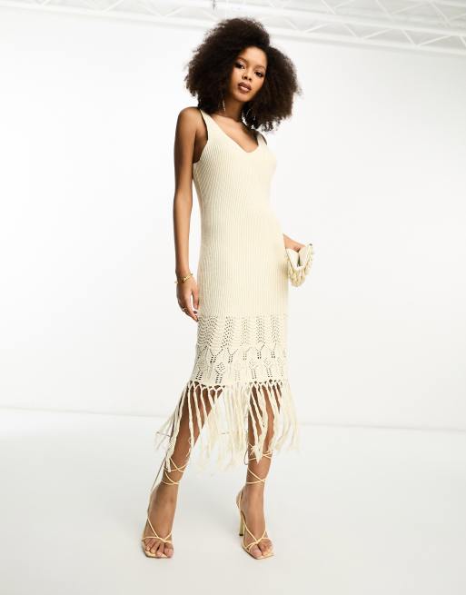 YAS - Gehaakte maxi rok met franje aan de zoom in crème