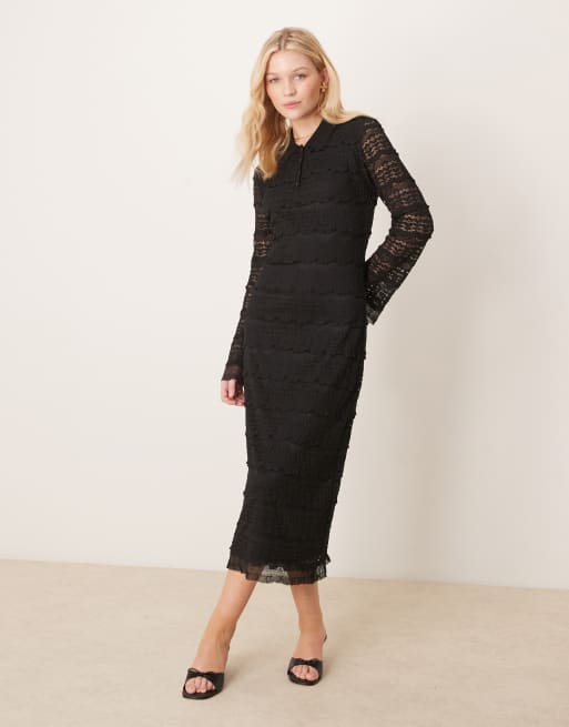 YAS - Midi jurk van getextureerd kant met polokraagje in zwart
