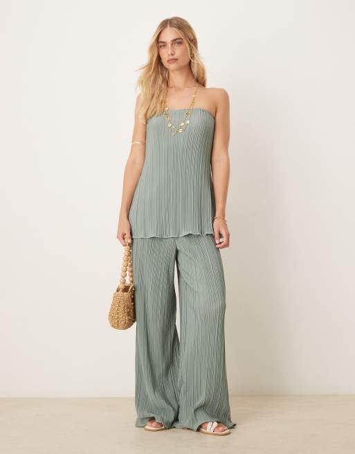 YAS - Plissé broek met wijde pijpen en omgerolde zoom in zachtgroen, deel van co-ord set