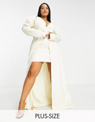 Yaura Plus - Mini jurk met ongelijke zoom, pofmouwen en sleep in ivoor
