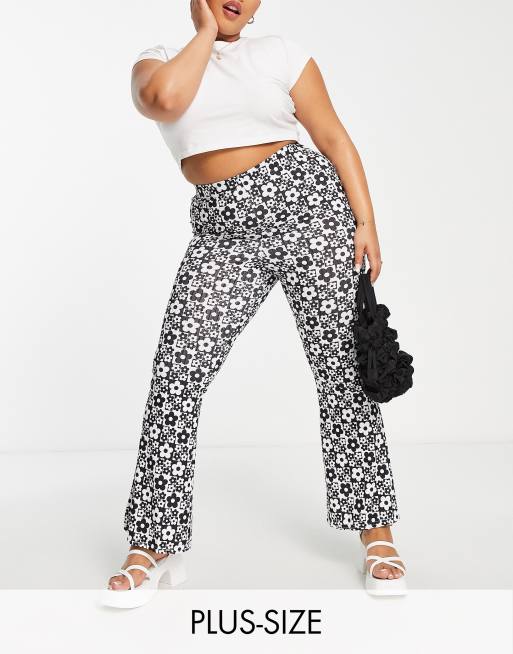 Yours - Flare-broek met retro bloemenprint in zwart-wit
