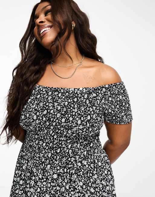 Yours - Gesmokte maxi bardotjurk met fijne madeliefjesprint in zwart-wit