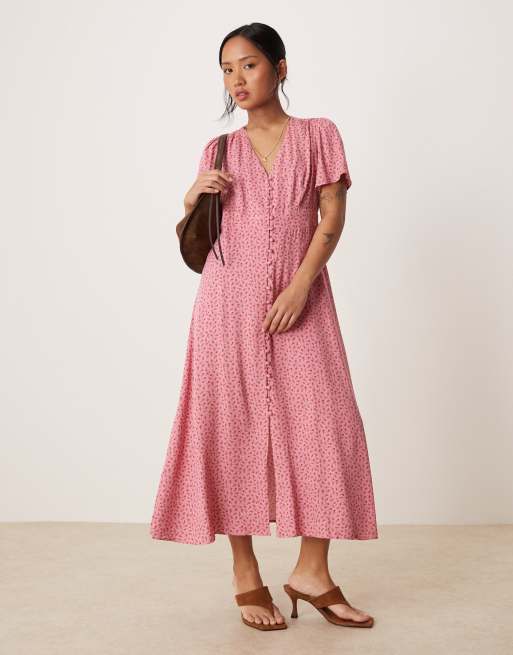 Nobody's Child Petite Andie button front midi tea dress in pink rosebud