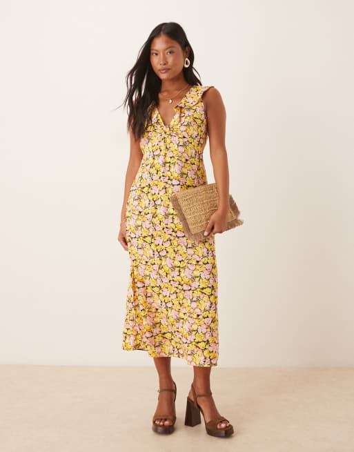 Nobody's Child Petite Beck ruffle shoulder midi dress in yellow and pink floral