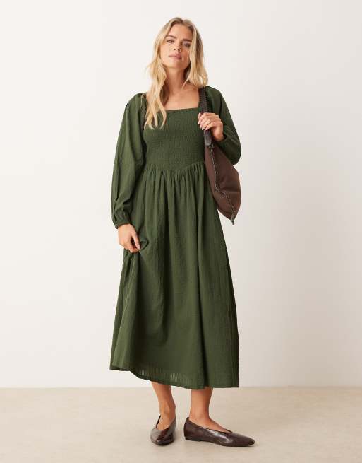 Nobody's Child Petite Imogen cotton shirred bodice balloon sleeve midi dress in khaki