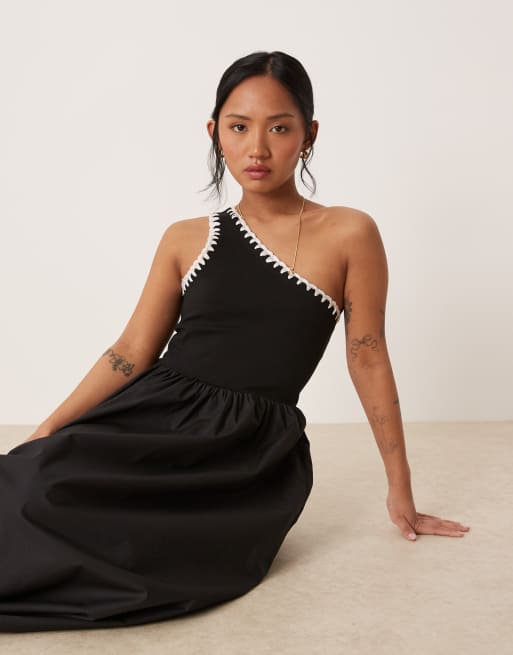Nobody's Child Petite Sabrina one shoulder midi dress with crochet trim in black