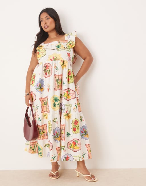 Nobody's Child Plus Cassidy ruffle tiered midi dress in postcard fruit print