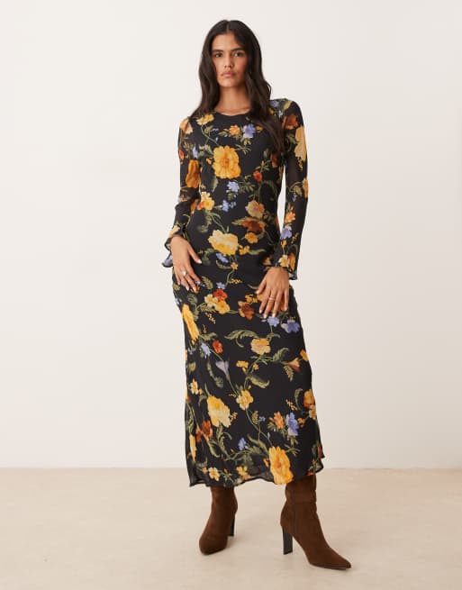 Nobody's Child Clarissa flare sleeve midi dress in black floral