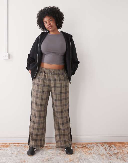 Noisy May Curve wide leg trouser with side stripe in beige check