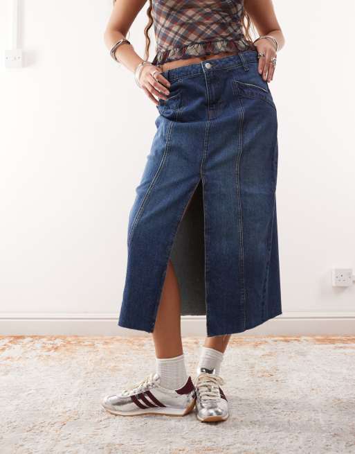 Noisy May A-line denim midi skirt in mid blue