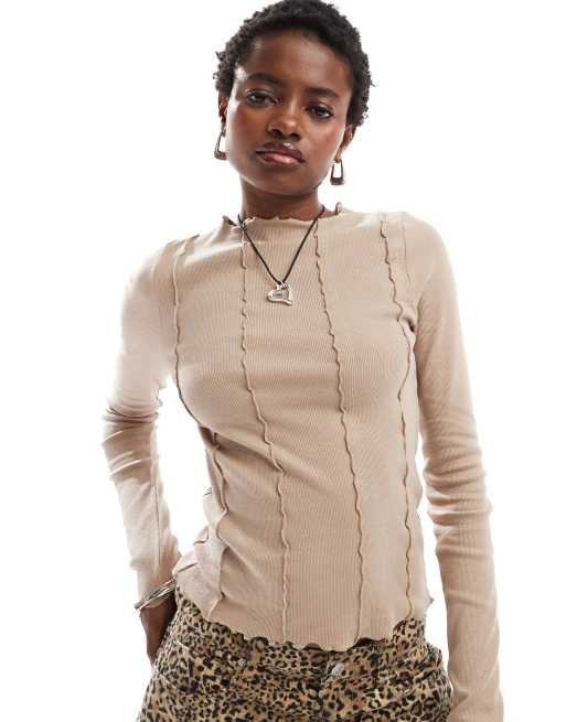 Noisy May lettuce edge long sleeve top with seam detail in beige