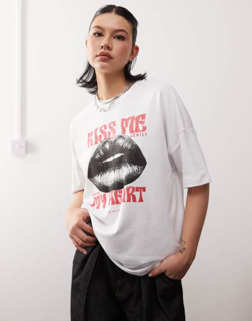 Noisy May oversize t-shirt with kiss me print in white
