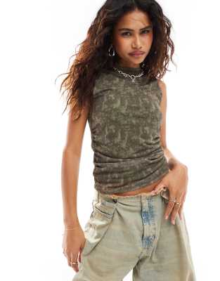 Noisy May rushed sleeveless top in dark olive washed print