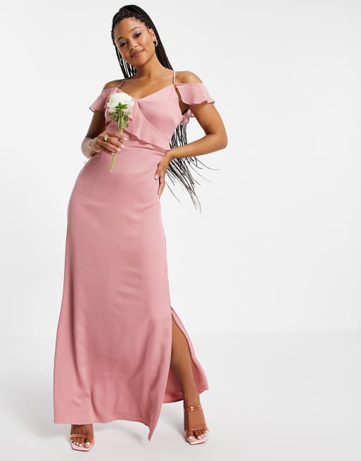 Oasis Bridesmaid bardot slinky maxi dress in pale pink