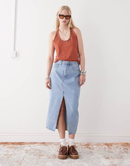 Obey Simplex denim midi skirt with front slit in light wash blue