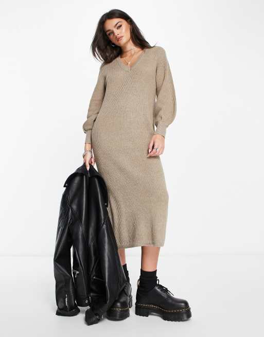 Object knitted midi jumper dress with balloon sleeves in taupe
