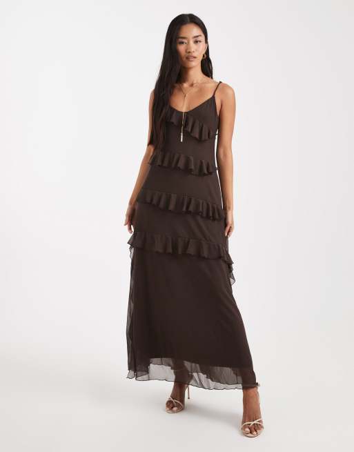 Object mesh ruffle cami maxi dress in chocolate brown