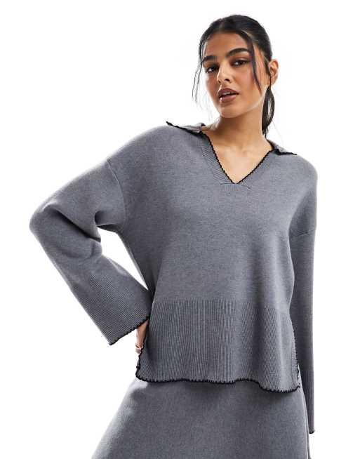 Object oversized v neck jumper co-ord with contrast trim in grey