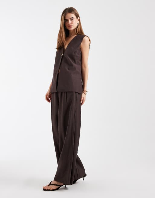 Object sleeveless tailored waistcoat and pleat front wide leg trousers set with gold button detail in chocolate