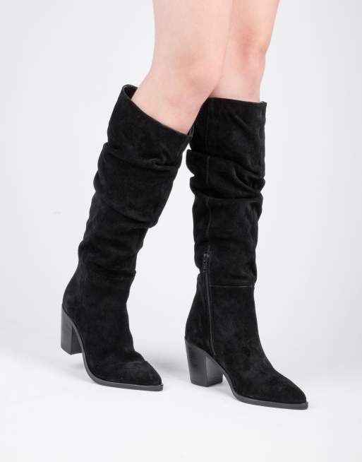 Off The Hook Muswell suede leather slouchy knee-high block heel boots in black