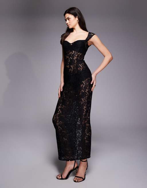 Oh Polly lace sweetheart neck cap sleeve mesh maxi dress in black