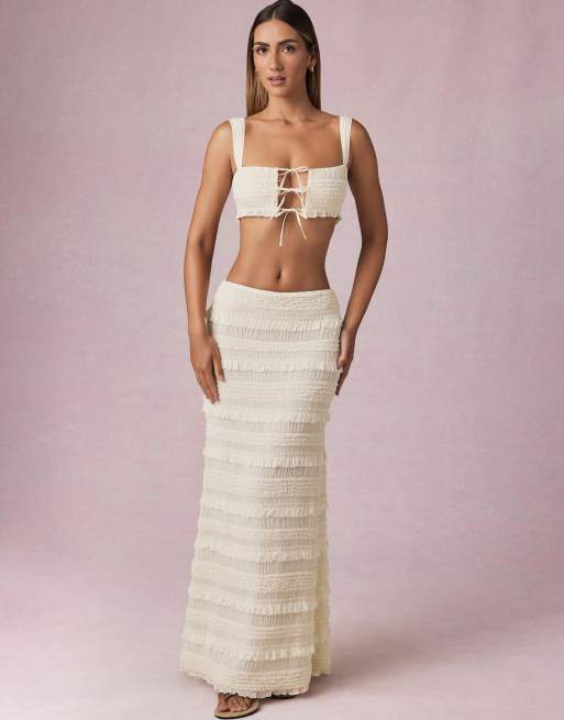 Oh Polly mid rise ruffle trim tiered maxi skirt in ivory